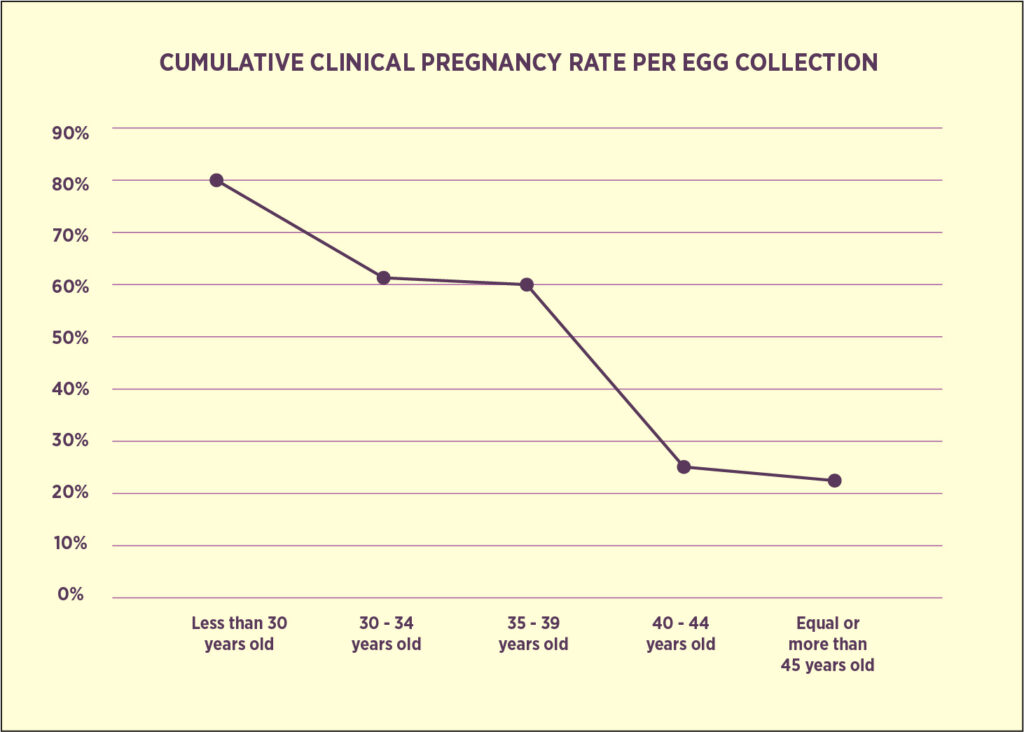 With data based on our cumulative clinical pregnancy rate per egg retrieval from 2016, the overall pregnancy rate with IVF at Thomson Fertility is 60%. The table below reports the clinical pregnancy success rates based on age groups—the earlier a couple starts IVF treatment, the higher the rates of pregnancy success.